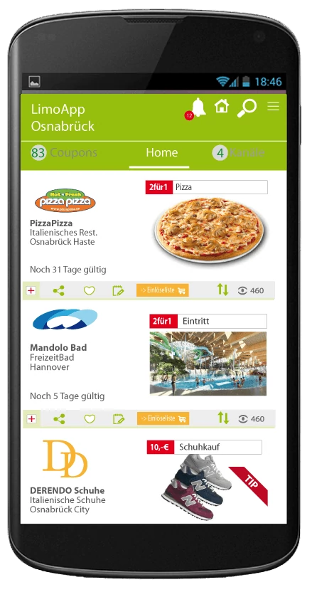 LimoApp Benutzer werden spontan und in Echtzeit über lokale Gutschein-Angebote informiert. Die Angebote können sofort im örtlichen Store, Geschäft, Lokal, etc. eingelöst werden.